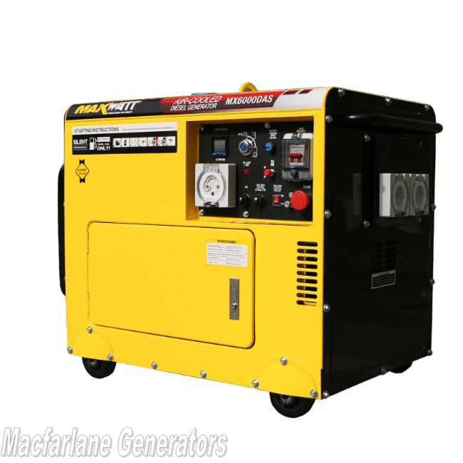6kVA Maxwatt MX6000DAS electric start with 2-wire auto diesel generator available from Macfarlane Generators