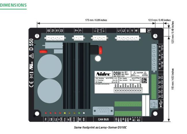 Genuine Leroy Somer D550 digital automatic voltage regulator (AVR) provides excitation current up to 7A with excellent reliability and precision for SHUNT, permanent magnet (PMG) or AREP (auxiliary winding) excitation types.